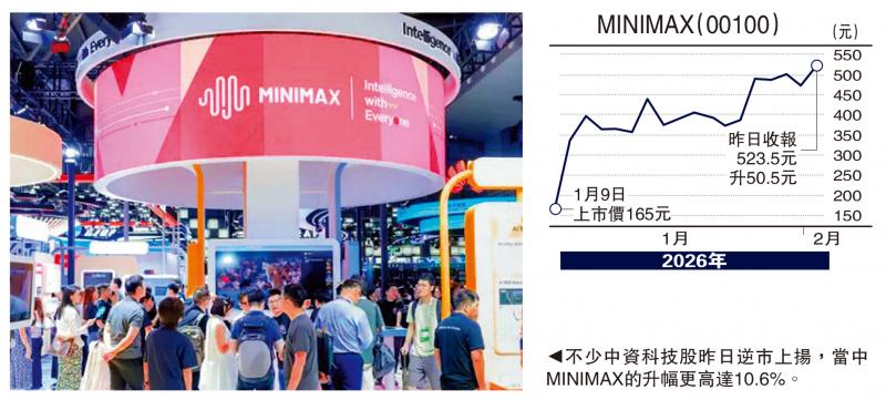 事实上,踏入2026年以来,内地A股及港股延续去年强势,截至上周五分别累升3.8%及6.9%,比标普指数及MSCI环球股市指数的1.4%及2.9%升幅为多。即使港股昨日一度跌近900点,但仍有中资科技股如MINIMAX(又称“稀宇科技”)(00100)逆市大升,可见环球资金持续加注中国金融资产,相信不少来自换马资金,即减持美元资产、增配人民币资产,这些换马资金特别看好中国科创突破陆续有来,令中资科技股愈升愈有,成为A股及港股上升主要动力来源,上海科创指数1月劲升12%,国产芯片、人形机器人及航天航空股等相关股份持续吸引资金流入。事实上,中国人形机器人产业发展速度超出市场预期,近日摩根士丹利将今年中国人形机器人产量预测由14000台倍增至28000台。目前已为国内外多间龙头机器人客户批量交付人形机器人、四足机器人和龙头模组、关节模组、灵巧手及结构件等的蓝思科技(06613),股价昨日力守28元支持位。