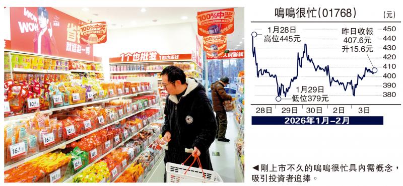 近日中国零食集团鸣鸣很忙(01768)在港上市,市场反应不俗,吸引淡马锡、贝莱德、富达及腾讯作为基石投资者,首日上市升69%,昨日股价冲上400元以上水平,可见内外投资者继续押注看好中国内需消费持续发力。去年中国消费品零售同比增长3.7%,比2024年加快0.2个百分点,预期今年增幅进一步提升。
