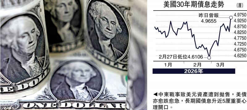 美国燃起中东战事持续近一个月,拖冧环球股市之外,自身金融亦受到重创,美元资产遭到抛售,美股步入技术调整,美债亦愈跌愈急,长期国债息升近5厘重要心理关口,忧虑融资成本失控上升,刺破股债资产泡沫,酿成新一波金融风暴。