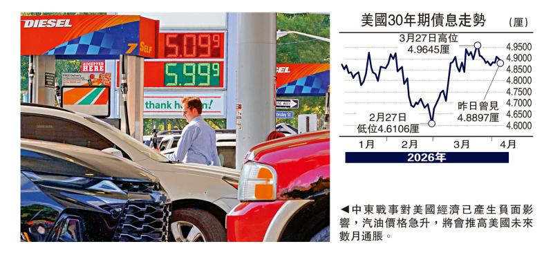 其实,美国通胀已急速恶化,3月消费者物价指数按年升幅上升至3.3%,为2024年5月以来最高,环比则大升0.9个百分点,升幅为2022年6月以来最劲。中东战事对美国经济已产生负面影响。根据美国汽车协会在4月初的数据,平均汽油价格上升至每加仑4.1美元,即较2月28日美以伊战事爆发以来,汽油价格上升了37%,将会继续推高未来数月通胀。经合组织预期2026年美国通胀率加速至4.2%,经济增长则减速2%,呈现明显滞胀。同时,华尔街大行纷纷上调美国通胀预测,其中美银将今年美国通胀估计大幅上调0.8个百分点至3.6%。若然如是,联储局年内减息机会不大,反有加息压力。