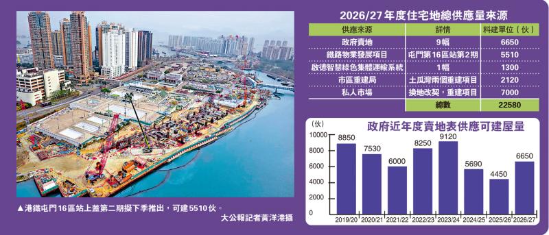 特区政府昨日公布下财年的卖地计划,各种来源均较之前两年有所增加。其中政府纳入卖地表拟出售的9幅住宅地,能提供约6650伙;来自铁路项目(包括启德智慧绿色集体运输系统住宅地)的供应约6810伙,较本财年增近1.8倍;来自市建局的重建项目供应约2120伙,较本财年也增1.6倍;来自私人市场则增1000伙至7000伙,总潜在供应料达22580伙。