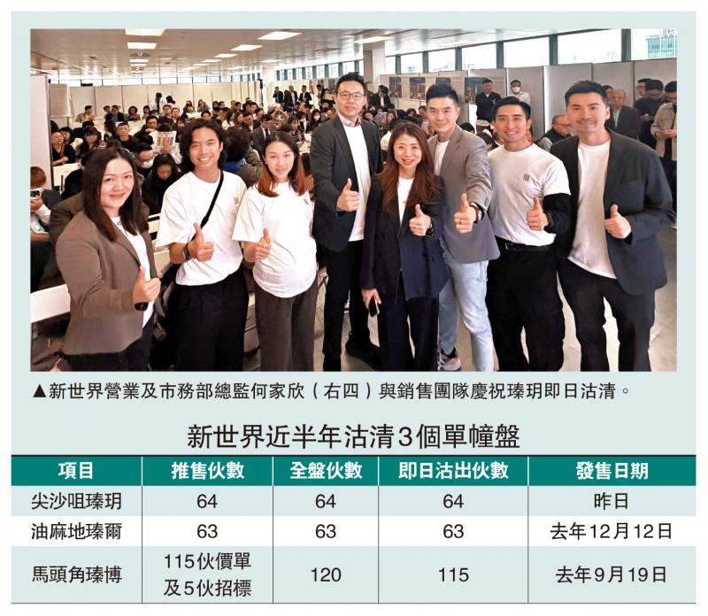 马年首个以价单发售的新盘打响头炮。新世界(00017)旗下尖沙咀瑧玥全盘64伙昨日齐推,全盘被大部分投资者抢购一空,S组大手时段录7组“西饼客”扫入全层,最大手一组豪客购两层6伙一房户,涉资逾3700万元。该盘为新世界过去半年第2个全盘沽清单幢项目。集团随后将部署重售大围站顶柏傲庄Ⅲ的挞订货。\大公报记者 梁颖贤