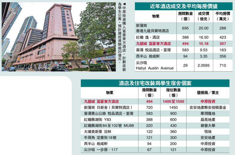 早于2024年落实在港首个学生公寓项目的中原投资,过去两年积极拓展,新近以15.18亿元购入富豪东方酒店。据资料显示,物业位于九龙城沙浦道30至38号,于1982年落成,楼高17层(包括2层地库),提供494间客房,面积129至1130方呎,按总楼面约22.9万方呎计算,成交呎价约6629元,折合平均每间房价值约307万元。