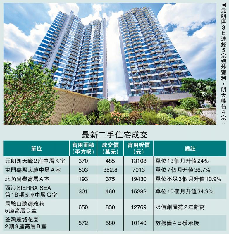 中东局势烽烟四起,但本港楼市暂未受影响,二手短炒成交如雨后春笋,本月已知短线获利个案近百宗,当中包括元朗区于过去3日录得的5宗获利成交,而在朗天峰的4宗个案中,有2房单位在约13个月账面升值24%。\大公报记者 林惠芳