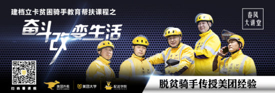 “五一”期间,美团大学配送学院将面向全行业建档立卡贫困外卖配送员推出《奋斗改变生活——脱贫骑手传授美团经验》系列视频课程。培训将邀请脱贫骑手以及外卖配送站点管理者,讲述如何安全地多跑订单、如何保持阳光心态接人待物等等实际工作中常见的问题,以自身经验帮助贫困骑手快速成长,融入城市生活。