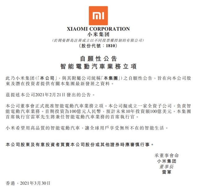 3月30日下午,小米集团在港交所发布公告称,公司董事会正式批准智能电动车业务立项,首期投资为100亿元人民币,雷军兼任首席执行官。
