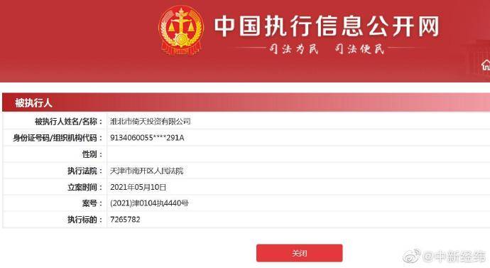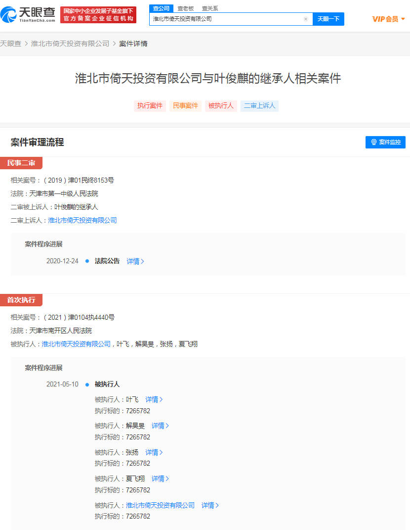 中新经纬客户端从中国执行信息公开网获悉,近日,叶飞及其关联公司淮北市倚天投资有限公司等已成为被执行人,执行标的7265782元,案号(2021)津0104执4440号,执行法院为天津市南开区人民法院。