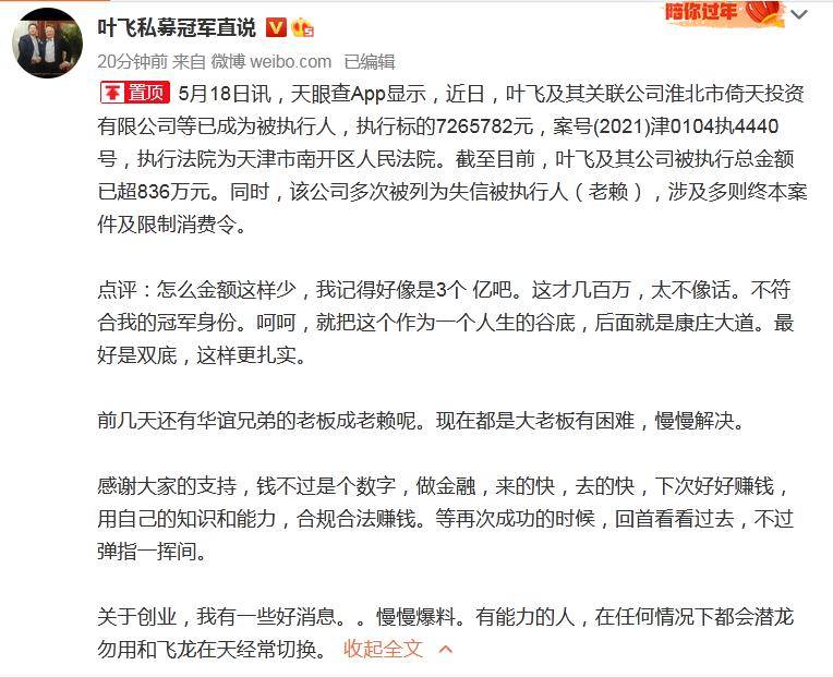 对此,叶飞在官方微博回应称,“怎么金额这样少,我记得好像是3个亿吧。”他说,“就把这个作为一个人生的谷底,后面就是康庄大道。前几天还有华谊兄弟的老板成老赖呢。现在都是大老板有困难,慢慢解决。”