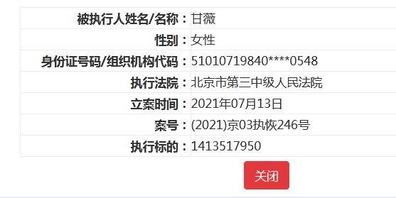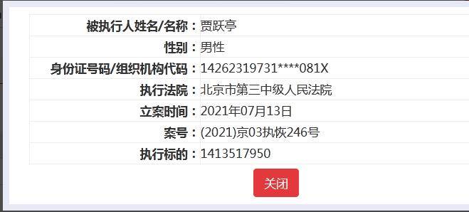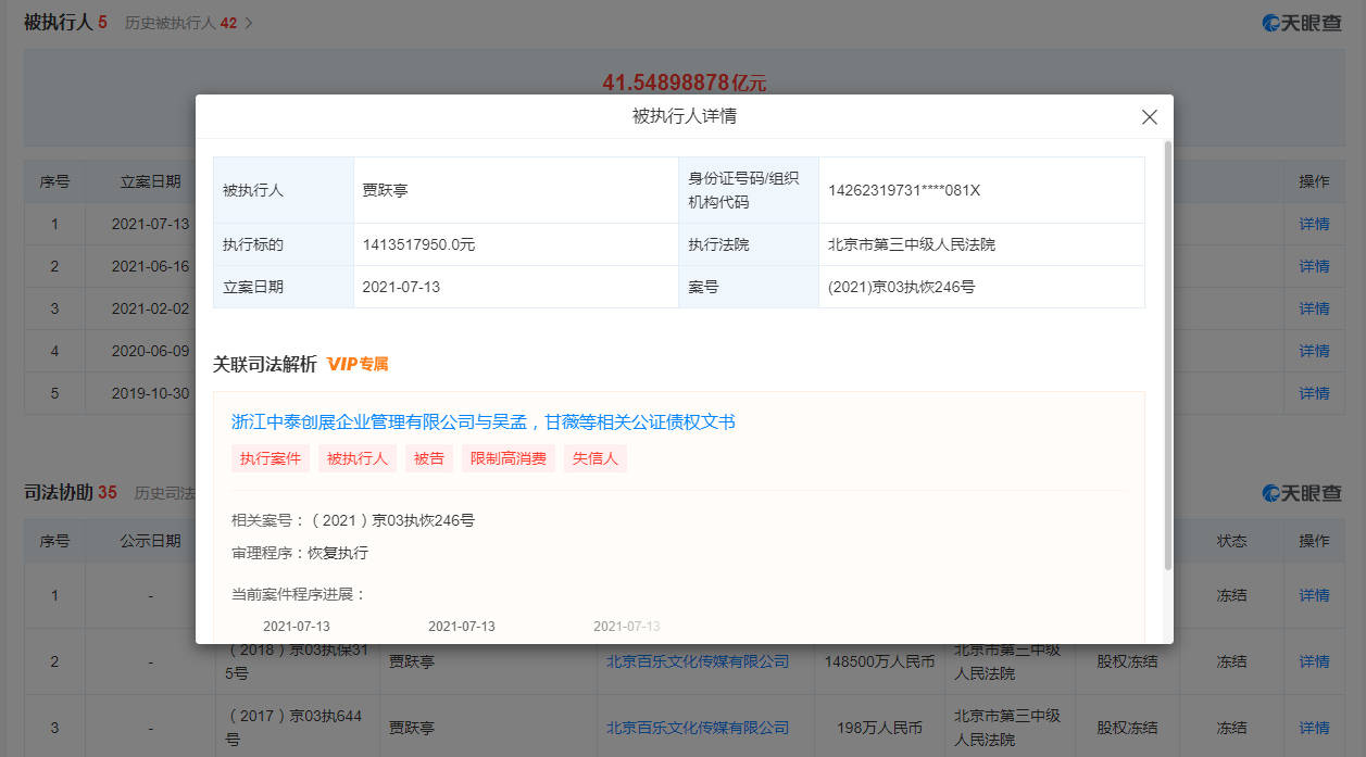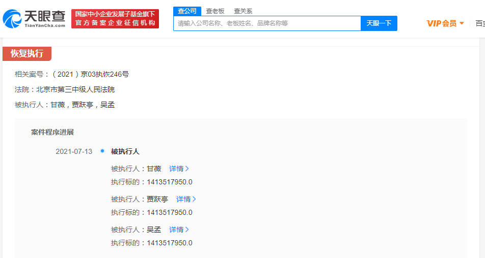中国执行信息公开网显示,7月13日,贾跃亭被执行标的达1413517950元,执行法院为北京市第三中级人民法院,执行案号(2021)京03执恢246号。同时,甘薇也成为被执行人,执行法院、案号、执行标的与贾跃亭一致。