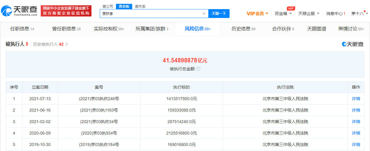 截至目前,贾跃亭已存在多条被执行人信息,被执行总金额超41亿元。