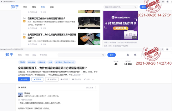 本案源于3天前的一个知乎话题。9月25日,知乎上出现“全网互联互通下,为什么抖音对屏蔽第三方外链保持沉默”的话题。该话题在知乎热榜最高排名第17位,目前浏览量58万多,有106个回答。上榜后,该话题被知乎官方锁定,其他人无权编辑。