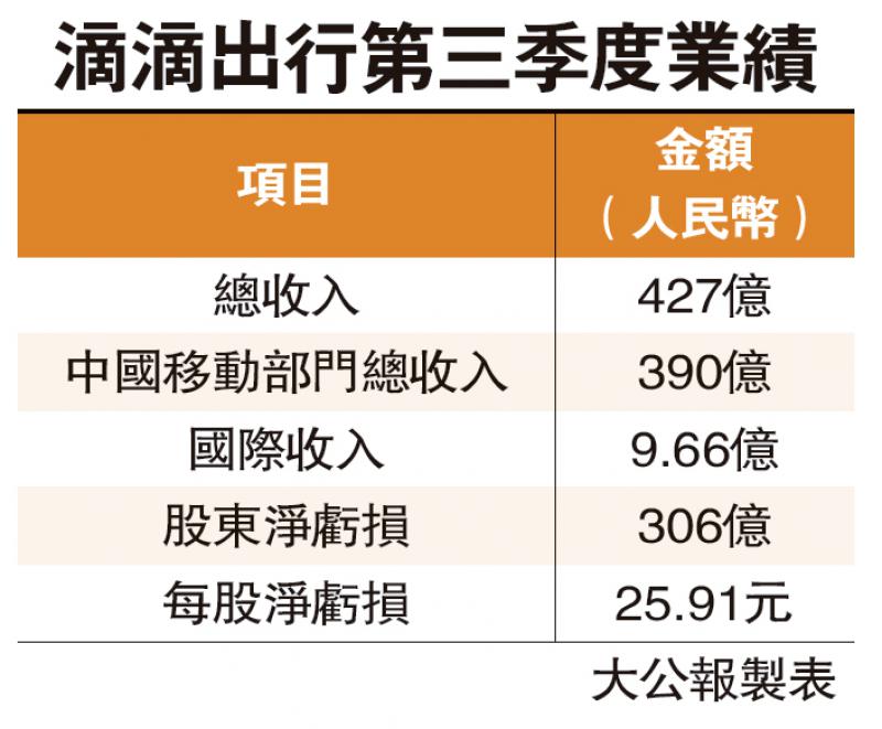 正准备来港上市的内地网约车平台滴滴出行(US:DIDI)公布季度业绩,第三季度亏损306亿元(人民币,下同),前一季亏损244亿元,经调整后EBITA亏损75亿元,每股淨亏损25.91元,主因是投资亏损淨额208亿元。同时,阿里巴巴(09988)董事会主席张勇将辞任滴滴出行董事一职。