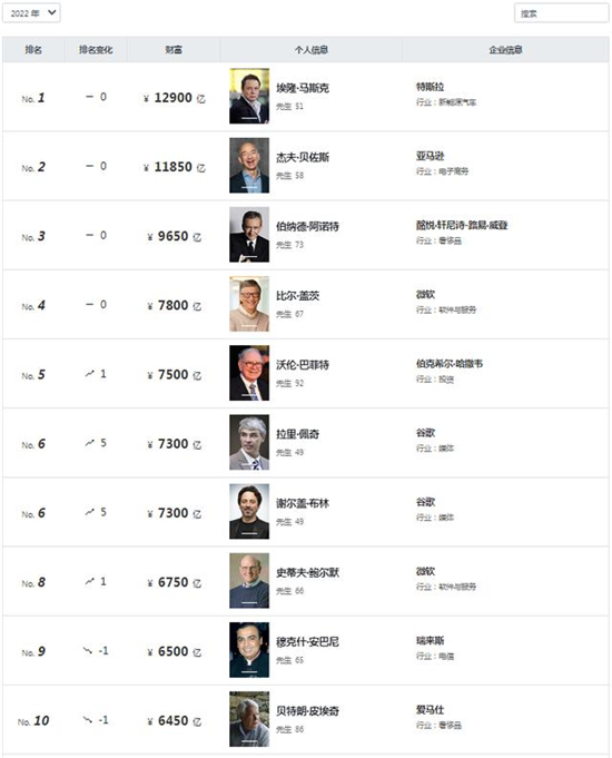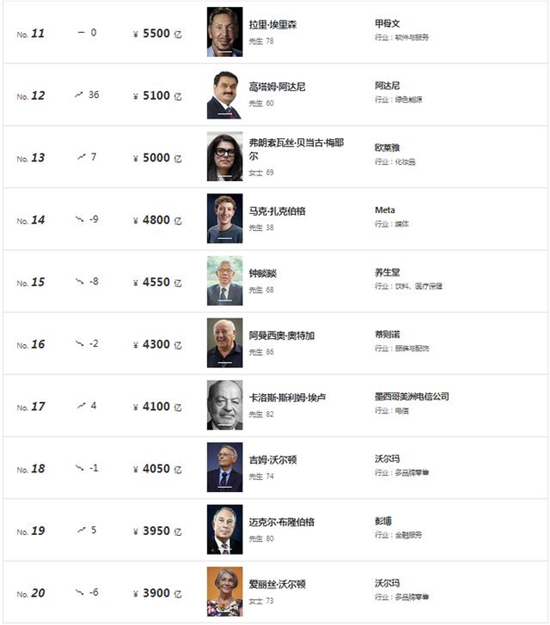 榜单还显示,特斯拉50岁的埃隆·马斯克以1.29万亿元人民币连续第二年成为世界首富,比去年增长了4%。农夫山泉68岁的钟睒睒财富虽然下降了近1000亿元,但仍以4550亿元蝉联中国首富,全球排名第15位。