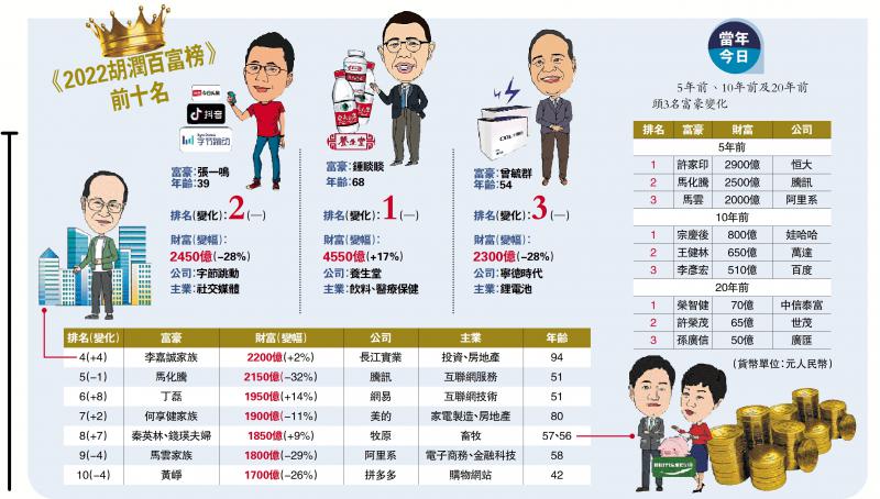 2022年胡润百富榜昨日发布。农夫山泉董事长锺睒睒以4550亿元(人民币,下同)身家蝉联榜单冠军;紧随其后的是字节跳动的张一鸣和宁德时代的曾毓群,两人的身家分别达到2450亿及2300亿元。今年前3位排名与去年没有变化,但在全球经济放缓下,张一鸣及曾毓群身家均下降28%。同时,今年上榜的富豪人数及富豪总身家较去年录双位数下跌。此外,今年传统行业上升明显,大多数上榜企业家主要在内地市场创造财富。