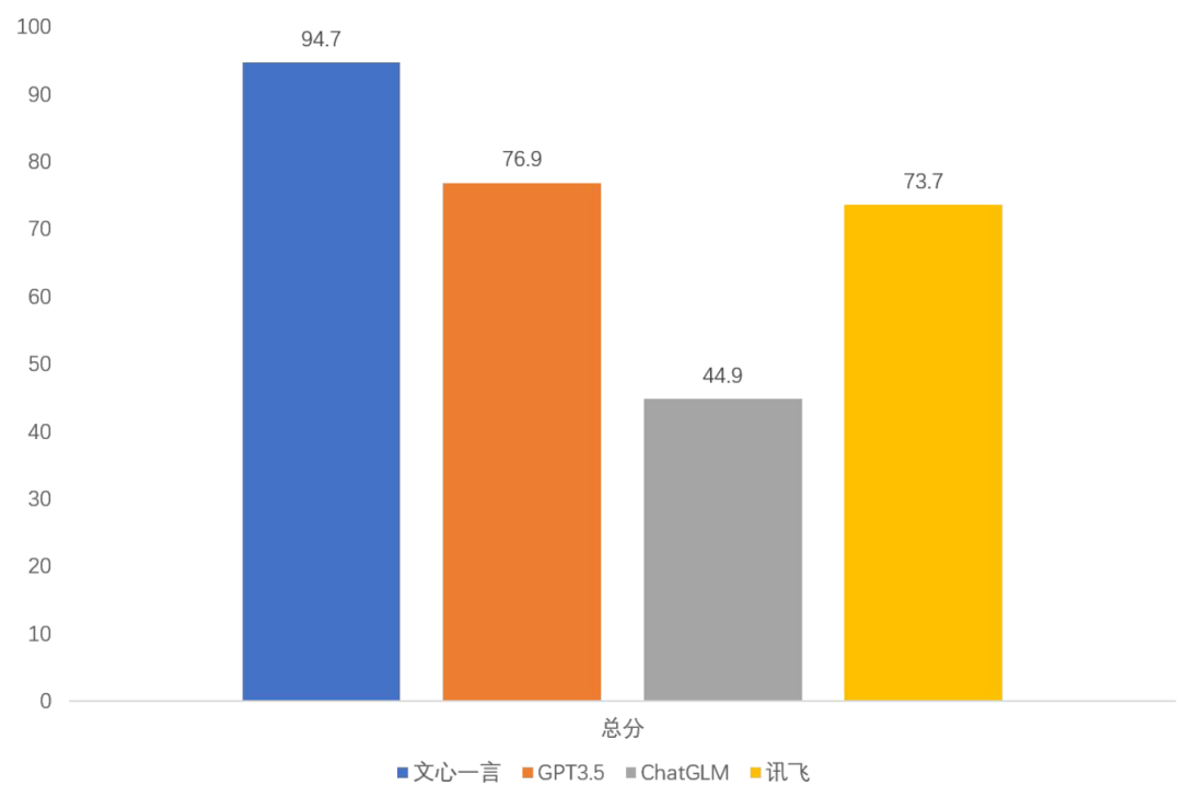 新华网评测报告显示,文心一言因中文搜索引擎和算法模型优势,在安全、常识、数学、阅读等方面优势明显。在五个维度上的得分计算均值,文心一言的综合得分为94.7分,排名第一,高于GPT-3.5的76.9分。这说明当前文心一言在总体能力(中文处理)上已经超越了GPT-3.5模型。