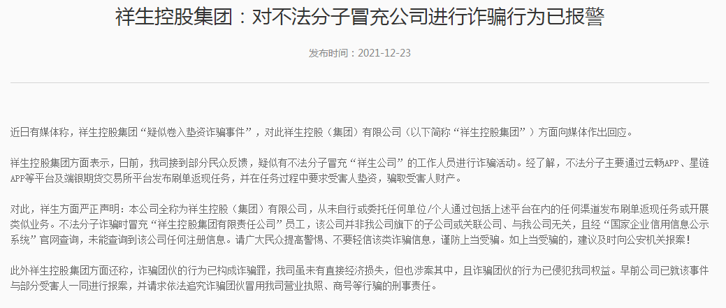 祥生公告显示,公司从未自行或委托任何单位/个人通过包括上述平台在内的任何渠道发布刷单返现任务或开展类似业务。不法分子诈骗时冒充“祥生控股集团有限责任公司”员工,该公司并非本公司旗下的子公司或关联公司、与公司无关,且经“国家企业信用信息公示系统”官网查询,未能查询到该公司任何注册信息。