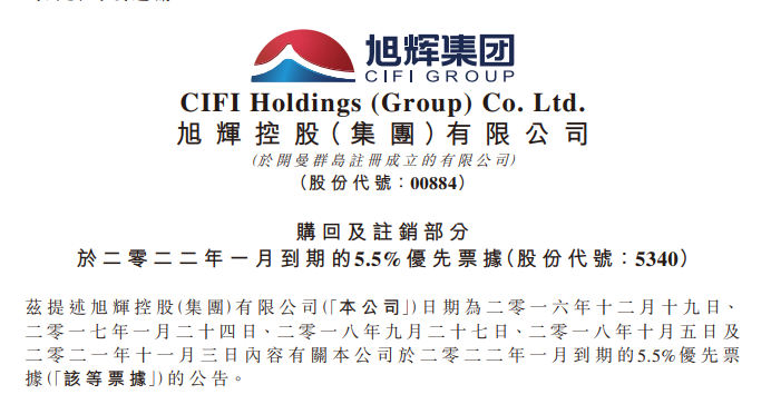 据悉,旭辉控股分别于2016年12月19日、2017年1月24日、2018年9月27日、2018年10月5日及2021年11月3日发布5.5%优先票据(以下简称“该等票据”),且该等票据于2022年1月到期。