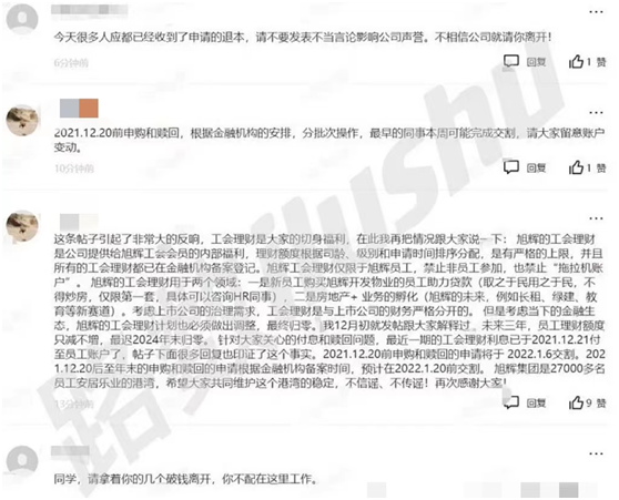 就在事件愈演愈烈之时,12月28日上午,旭辉CFO在论坛里紧急回应:"我12月初就发贴跟大家解释过,未来三年,员工理财额度只减不增,最迟2024年末归零。"