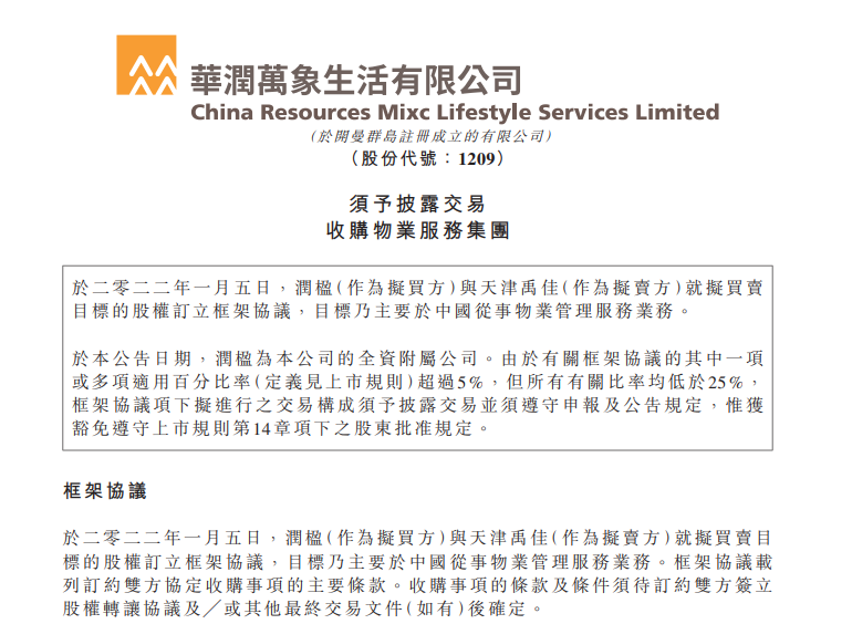 公告显示,华润万象生活全资附属公司润楹,与天津禹佳就拟买卖目标的股权订立框架协议,目标为主要于中国从事物业管理服务业务。