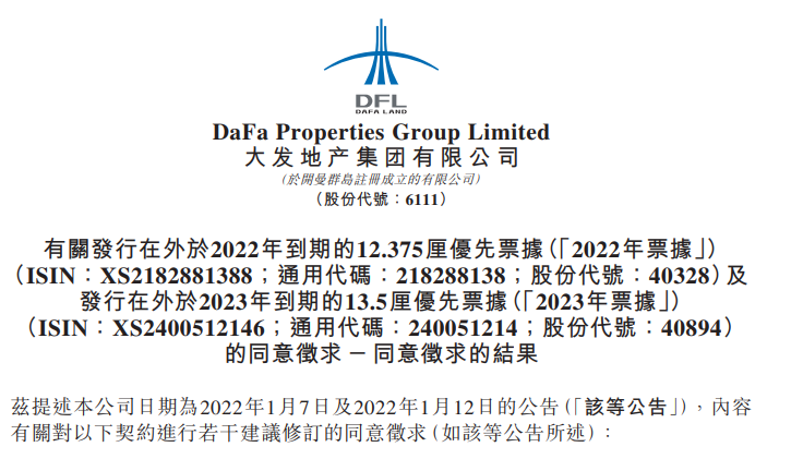 公告显示,大发地产曾于2022年1月7日、1月12日、1月14日发布关于两笔票据若干建议修订的同意征求。两笔票据分别为公司及子公司担保人与中国建设银行(亚洲)股份有限公司(下文简称“受托人”)于2020年7月30日订立的契约,规管其于2022年到期的12.375厘优先票据;及两笔票据分别为公司及子公司担保人与受托人于2021年10月28日订立的契约,规管其于2023年到期的13.5厘优先票据。
