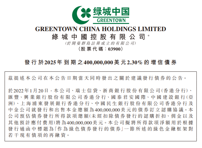 1月20日,绿城中国、、瑞士信贷、浙商银行股份有限公司(香港分行)、汇丰、兴业银行股份有限公司香港分行、国泰君安国际、中国建设银行(亚洲)、上海浦东发展银行香港分行、中国民生银行股份有限公司香港分行及中金公司就本金总额4亿美元的债券发行订立认购协议。