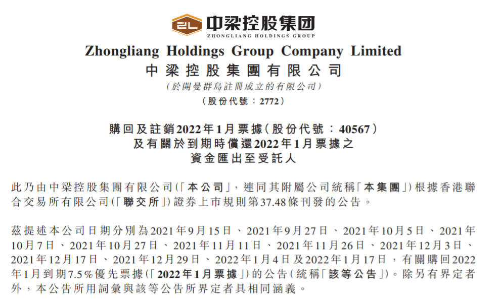大公房产讯 1月25日,中梁控股发布公告称,公司已将总额等于2022年1月票据的未偿还本金及应计利息的所有必要资金汇出至受托人,用于到期时偿还2022年1月到期7.5%优先票据的该等未偿还款项。