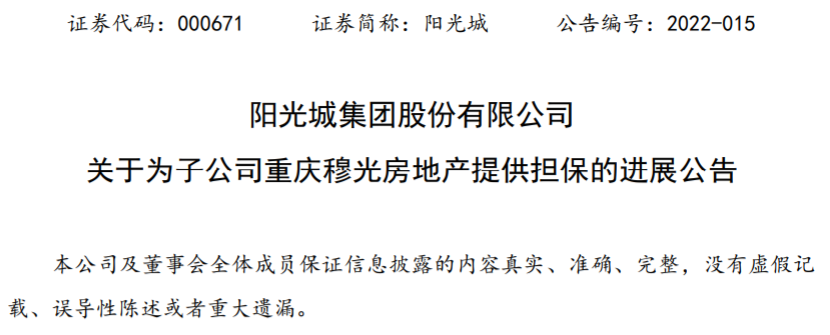 公告显示,阳光城于2020年7月2日披露了《阳光城集团股份有限公司关于为子公司重庆穆光房地产提供担保的公告》,公司持有85%权益的子公司重庆穆光房地产接受五矿信托提供12.3亿元的融资,期限不超过24个月。