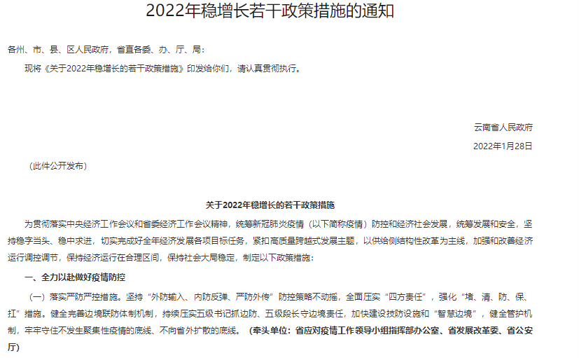 大公房产讯 1月30日,云南省人民政府印发《关于2022年稳增长若干政策措施的通知》(下文简称《通知》)。