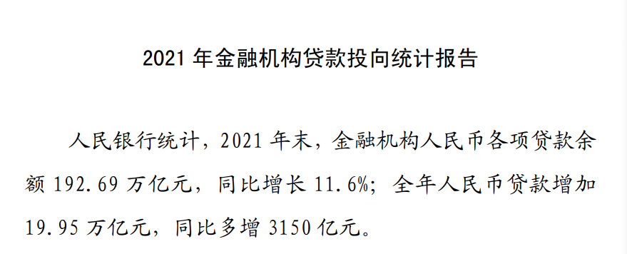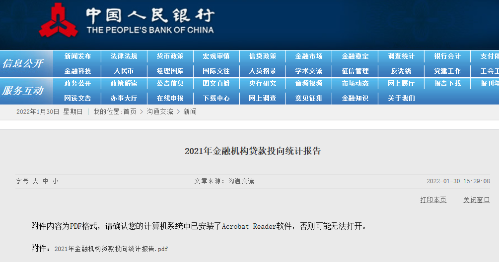 大公房产讯 1月30日,中国人民银行发布《2021年金融机构贷款投向统计报告》(下文简称《报告》)。