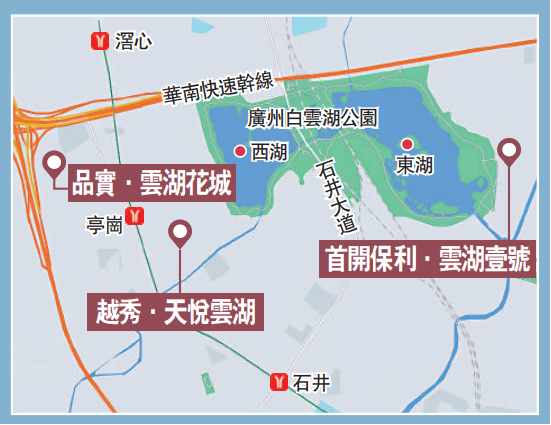 目前白云湖周边的新盘,有主打“地铁+学校”的品实.云湖花城;以“地铁+湖景”作卖点的越秀.天悦云湖;重点推销湖景风光的首开保利.云湖壹号,这三个项目每平米售价由4万至4.2万元(人民币,下同),价差不大。在白云湖的黄金围片区,则有中建.星光城、招商弘阳电建南国.雍云邸等项目,目前周边配套仍欠完善,两个楼盘未有具体价格,业界人士认为价格会比前三者稍低。