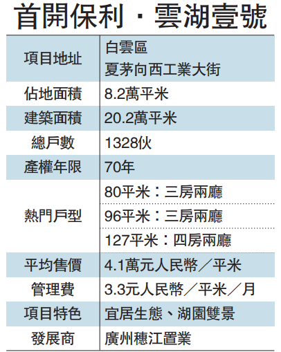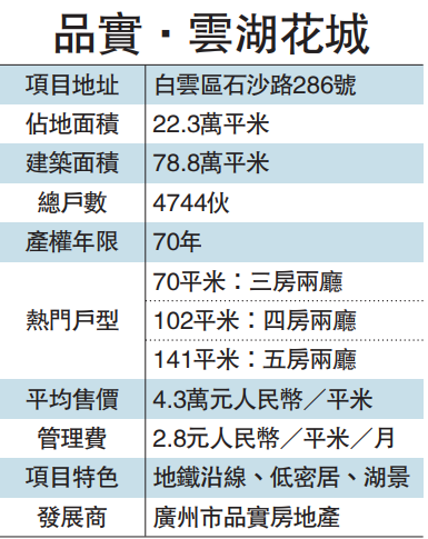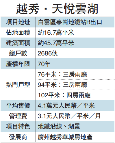 具体楼盘方面,越秀.天悦云湖是白云湖的其中一个新盘,属低密度高端精品住宅,每平米售价4.1万元(约5万港元)。