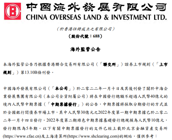 大公房产讯 2月17日,中国海外发展发布海外监管公告。公告显示,公司全资附属公司中海企业发展集团有限公司将在中国发行总额不超过40亿元的境内人民币中期票据。
