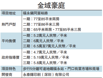 他透露,目前金域豪庭一、二、三期的市场成交价每平米分别为5万多、6万及6.5万至7万元;而政府指导价每平米分别为4.7万、5.19万及5.8万元。金域豪庭63平米两房单位总价不到400万元,有利港人轻松上车。