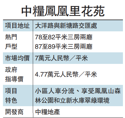 中粮凤凰里花苑2015年开盘时均价为每平米2.8万至3.5万元(人民币,下同),现在大户型6万余元,78至82平米的三房小户型市场价格为每平米7万元,政府指导价为4.77万元。从市场价看,如今市场价已较开盘价升值一倍。