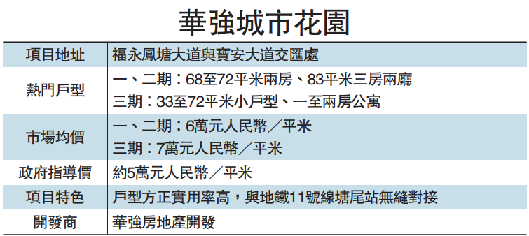 目前一期市场价大概每平米6万元(人民币,下同),政府指导价约5万元。由于交通方便,租金走高,两房户可租5000元(约6155港元),从西乡和宝安来的租户较多。