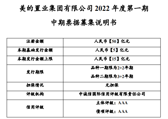 美的置业募集说明书显示,本期票据为2022年度第一期中期票据,发行金额为5亿元,发行金额上限为15亿元,品种一发行期限为2+2年期,品种二发行期限为3+2年期,中诚信国际信用评级有限责任公司对其信用评级结果显示,主体评级为AAA,债项评级为AAA。本期中期票据募集资金拟全部用于项目建设。