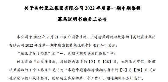 此外,美的置业还于2月23日发布关于该票据部分内容的更正公告。公告显示,付息日更正为“本期中期票据存续期内每年的2月28日”。还本付息方式更正为“本期中期票据每年付息一次,到期一次还本,最后一期利息随本金的兑付一起支付”等。