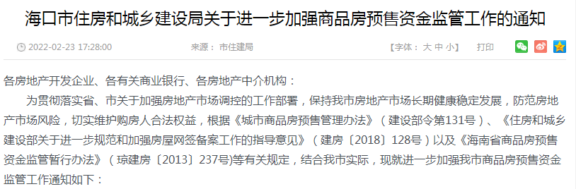 大公房产讯 2月23日,海口市住房和城乡建设局网站发布《关于进一步加强商品房预售资金监管工作的通知》(以下简称《通知》)。《通知》自发布之日起施行,有效期3年。