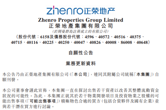 正荣地产董事会表示,本集团一直在探讨出售若干资产以改善其整体流动资金状况的可能性。为此,本集团正就其于若干物业开发项目及投资物业之股权的可能出售事项积极物色合适的买方(包括合资伙伴及国有企业)并与若干潜在买方进行讨论。