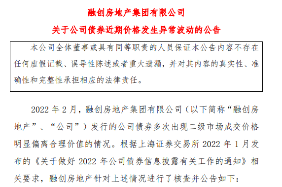 公告显示,2022年2月,融创发行的公司债券过多次出现二级市场成交价格明显偏离合理价值的情况。根据上海证券交易所2022年1月发布的《关于做好2022年公司债券信息披露有关工作的通知》相关要求,融创针对上述情况进行了核查。