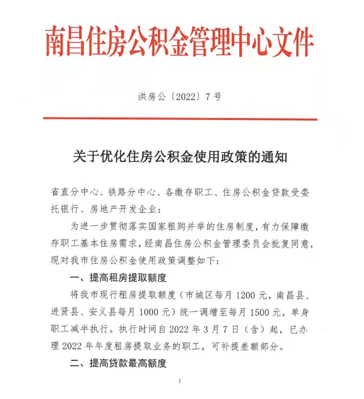 《通知》显示,为进一步贯彻落实国家租购并举的住房制度,有力保障缴存职工基本住房需求,经南昌住房公积金管理委员会批复同意,对南昌市住房公积金使用政策进行调整。将现行租房提取额度(市城区每月1200元,南昌县、进贤县、安义县每月1000元)统一调增至每月1500元,单身职工减半执行。