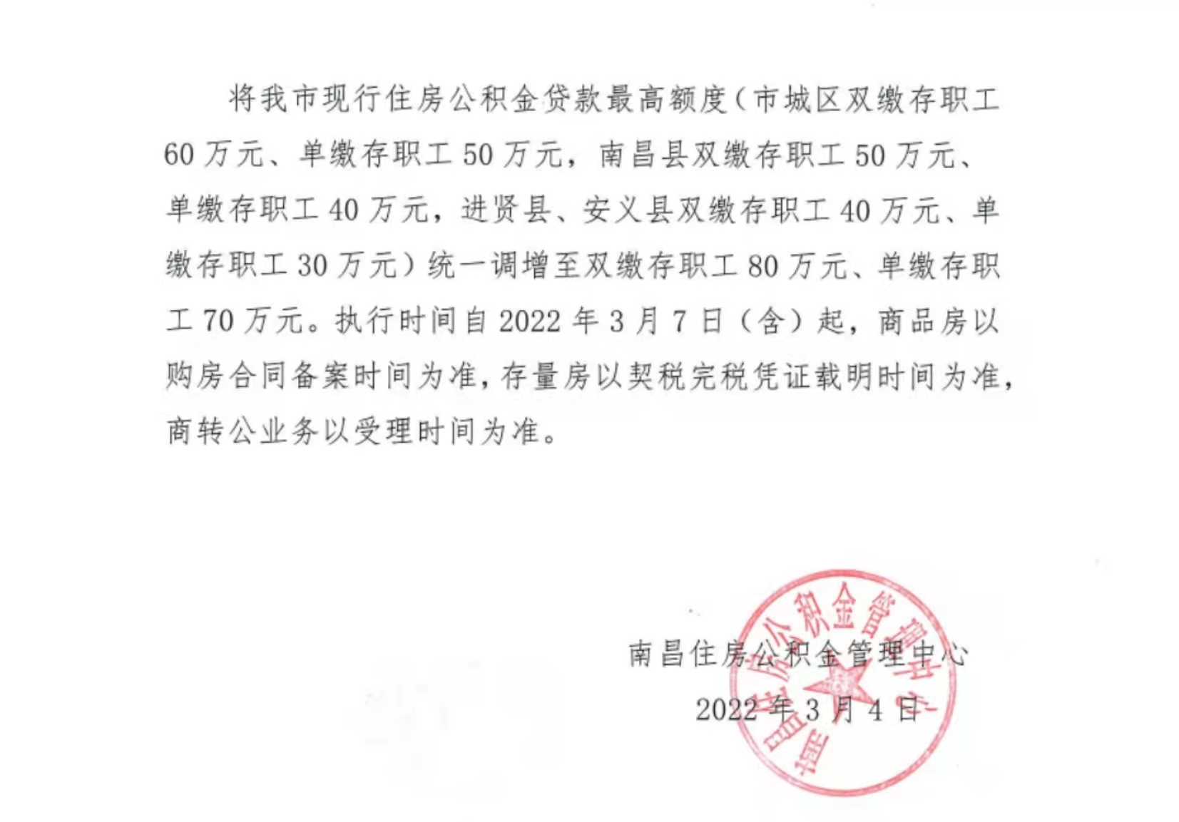 与此同时,将南昌市现行住房公积金贷款最高额度(市城区双缴存职工60万元、单缴存职工50万元,南昌县双缴存职工50万元、单缴存职工40万元,进贤县、安义县双缴存职工40万元、单缴存职工30万元)统一调增至双缴存职工80万元、单缴存职工70万元。