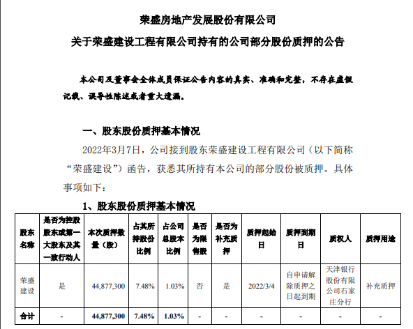 大公房产讯 3月7日,荣盛发展发布关于公司控股股东荣盛建设持有公司部分股份质押的公告。