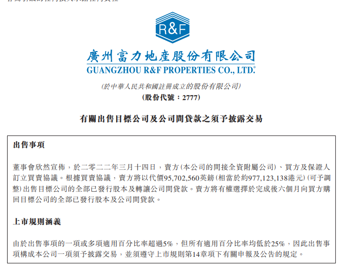 3月14日,富力地产间接全资附属公司翘采有限公司作为卖方,远东发展有限公司的间接全资附属公司作为买方,富力地产(香港)有限公司、李思廉作为保证人,共同订立买卖协议。根据协议,卖方将以代价约9570万英镑出售目标公司(R&F Properties VS (UK) Co., Ltd.,富力地产间接全资附属公司)全部已发行股本及转让公司间贷款。其中,公司间贷款为目标集团应付予卖方及本公司若干附属公司的所有款项,合共将不少于1.65亿英镑。