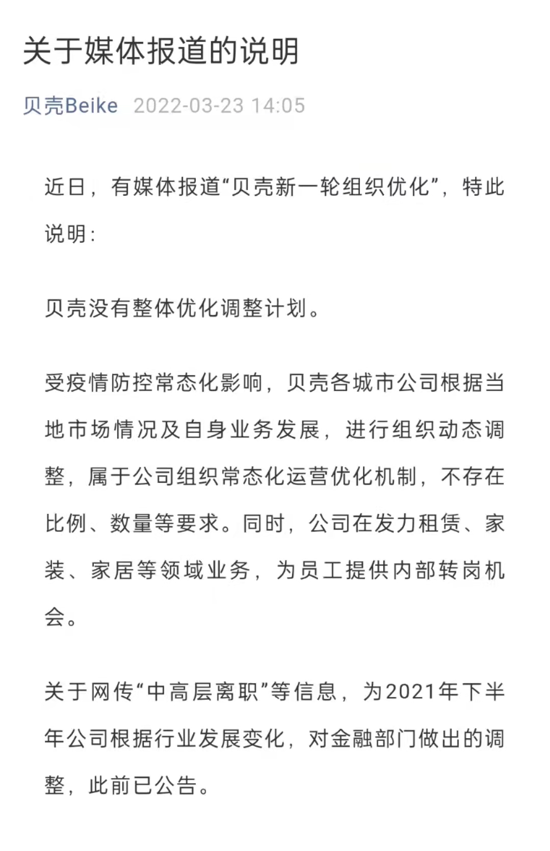 大公房产讯 3月23日,贝壳发布关于媒体报道说明。近日,有媒体报道称“贝壳新一轮组织优化”。对此,贝壳表示,公司没有整体优化调整计划。