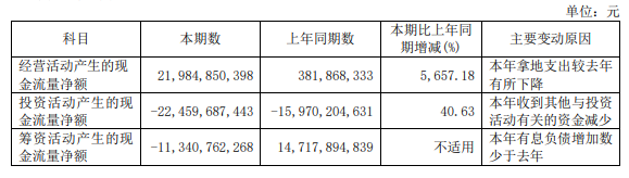 而由于拿地减少,年报显示,2021年新城控股全年取得的经营性现金流净额同比2020年的3.819亿元,暴增了超56倍,达到约219.8亿元。