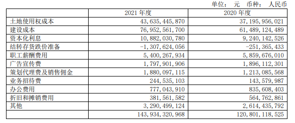 不过值得注意的是,虽然新城控股在通过减少拿地而保现金流,但与逐渐变少的土储面积形成对比的是,集团2021年的土地及建造成本较2020年上升了20.89%。
