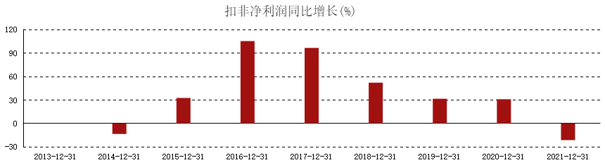 其余的归母净利润增速和扣非净利润增速更不用提,数据显示,从2017年到2021年,前者增速分别为74.02%、20.61%、20.56%、-17.42%,后者增速分别为51.87%、31.4%、30.8%、-21.53%,基本都是"断崖式下跌"。