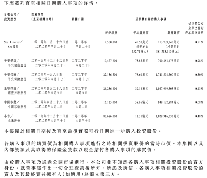 话音刚落,自2020年3月份起,合生创展就陆续购入了多家上市公司股份,包括250万股Sea股份、1042.72万股平安健康股份、2215.65万股平安保险股份、2623.68万股汇丰控股股份、1612.5万股中国移动股份及8368.6万股小米股份,总购买价合计约64.21亿港元,购入股份总数约1.6亿股。