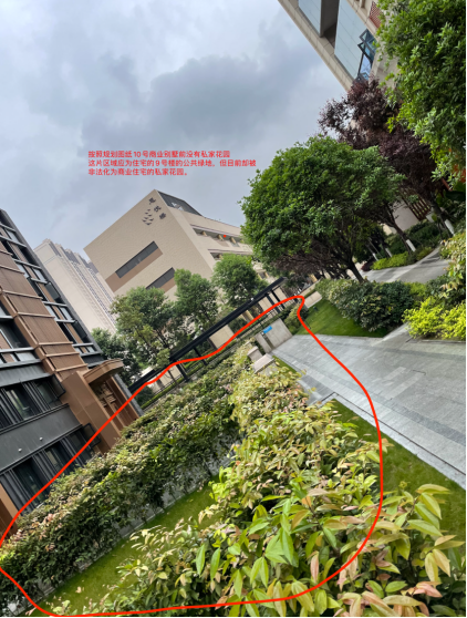 除了“通透式围墙”变“透明式围墙”,部分已入住的业主还发现,住宅9号楼与商业10号楼之间的住宅入口处的公共绿地,被开发商赠送给10号楼用户作为私家花园。